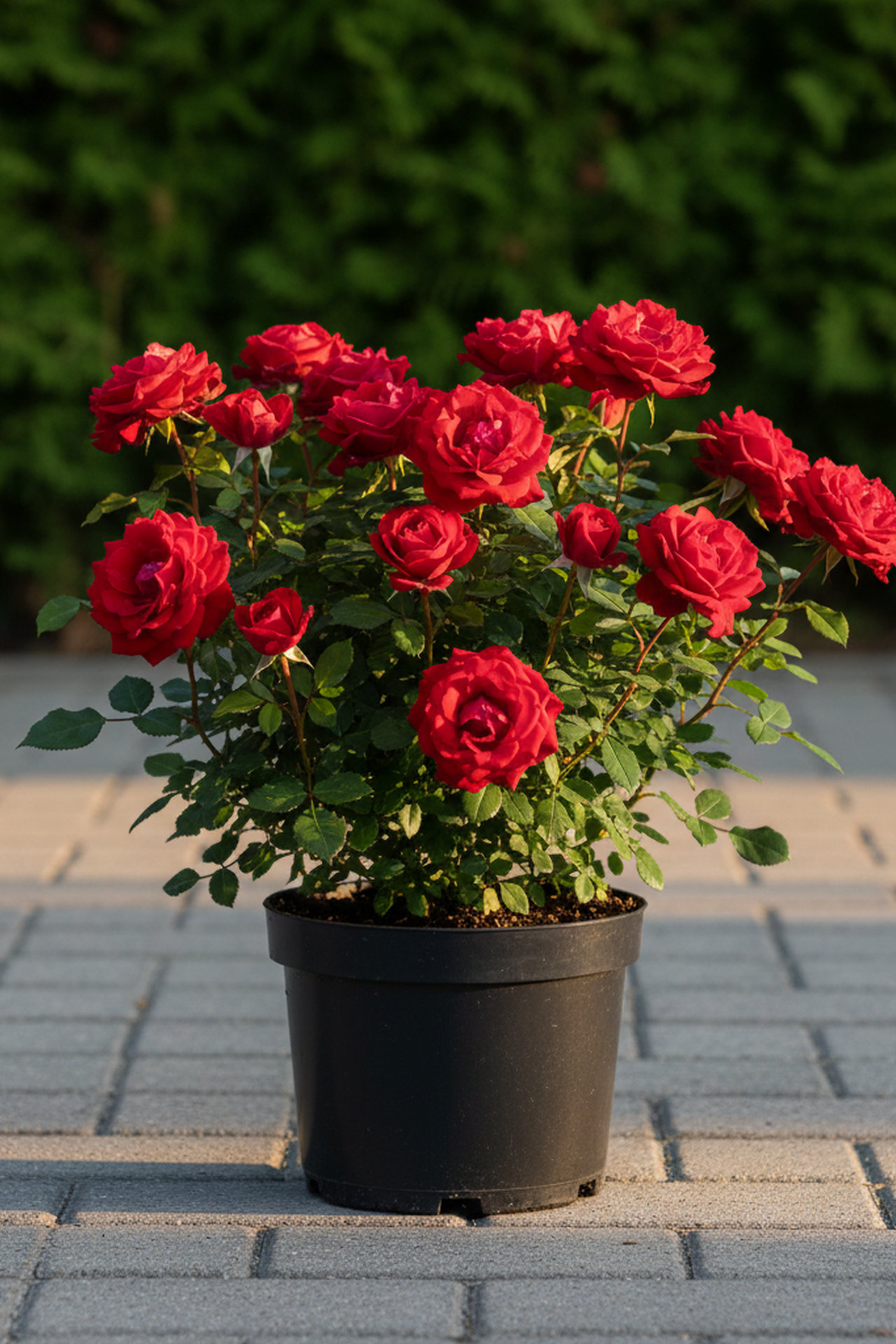 - Цветки махровые (около 40 лепестков), темно-красного цвета, чашевидной формы, до 9 см в диаметре, с нежным ароматом, собраны в крупные соцветия