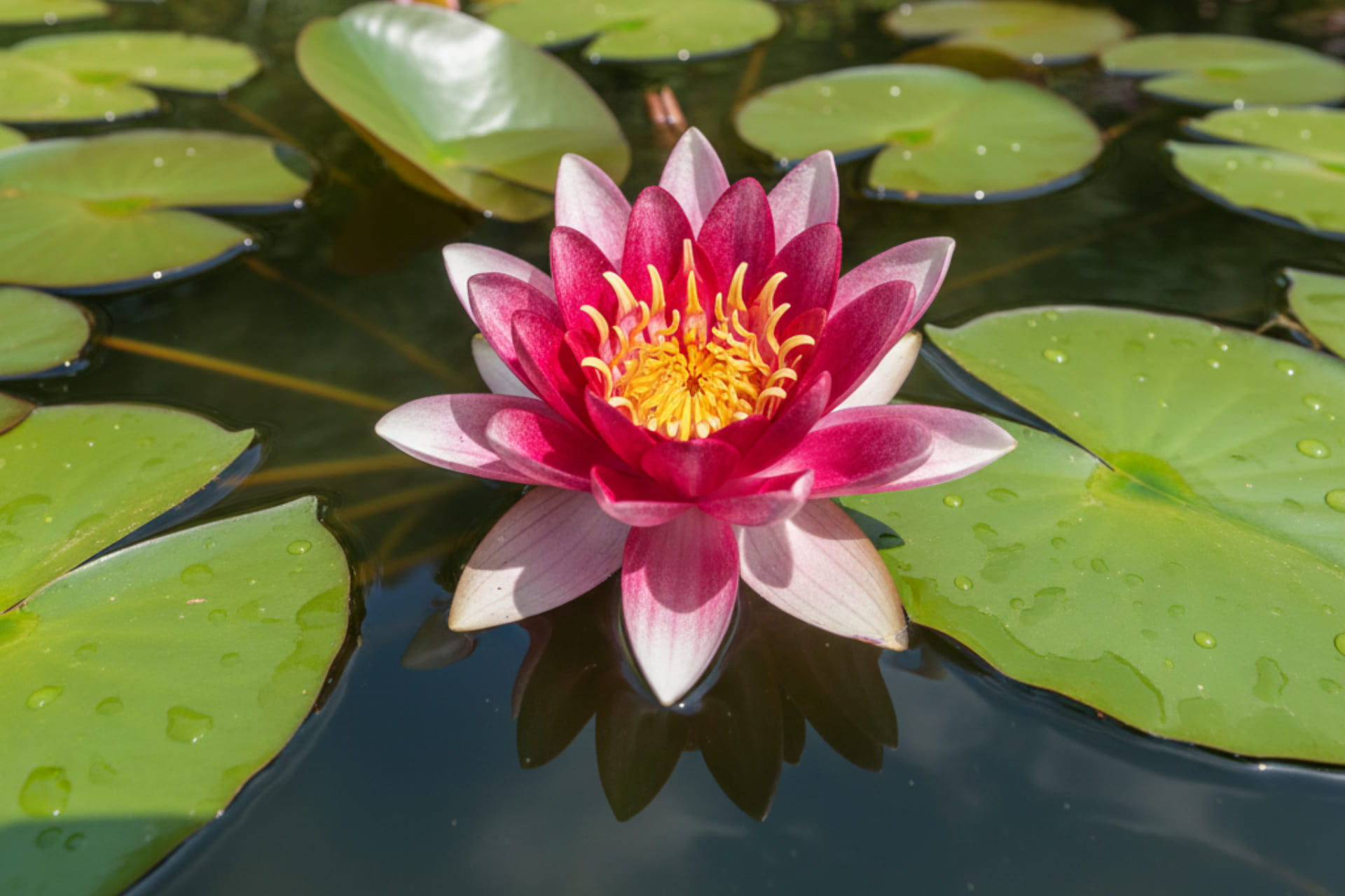 - Лепестки красные с белыми пятнами, тычинки ярко-желтые. Цветок чашевидный, располагается чуть выше поверхности воды, 18 см в диаметре, очень ароматный. Цветет обильно, сильно разрастается. На молодом растении цветки мелкие, бледно-розовые, на взрослом растении достигают 22 см в диаметре и приобретают красную окраску.